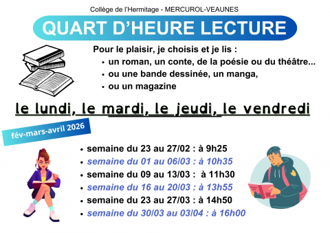Horaires du quart d'heure lecture en février-mars et début avril 2026 ! Pensez à prévoir une lecture (tout sauf manuel scolaire ou cahier de cours). Voici les horaires pour les semaines à venir. Précisions dans l'affiche ci-dessous.