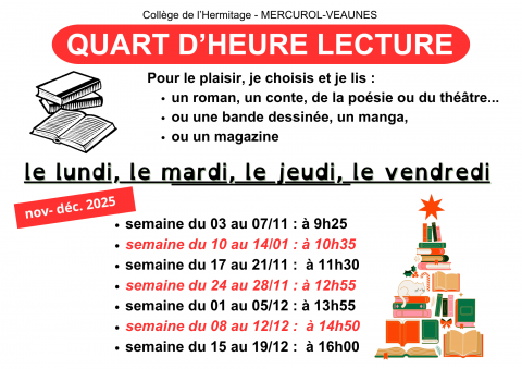 Horaires du quart d'heure lecture en novembre et décembre 2025 ! Pensez à prévoir une lecture (tout sauf manuel scolaire ou cahier de cours). Voici les horaires pour les semaines à venir. Précisions dans l'affiche ci-dessous.